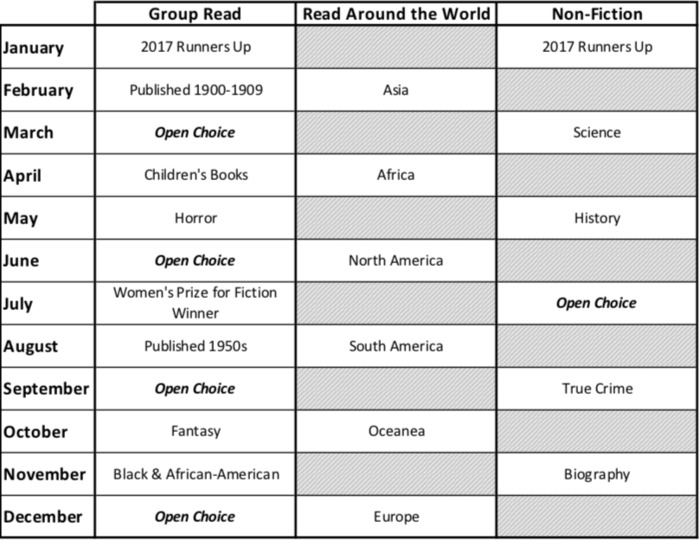 The decades idea earlier, I really like, but I think that probably works best as a challenge rather than a group read theme because to do a century requires 10 months dedicated just to that. And if/when we're consistently active enough to add a third group read in, I've already got my eye on it being a bi-monthly non-fiction between the 'read around the world' months.
