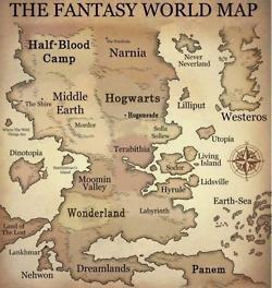 Ha look at this. They totally got most of the places wrong. Camp Half Blood is in New York not wherever that is, And Panem takes up all of North America. And Narnia...idk where Narnia is but it's not there next to Camp Half Blood. The labyrinth is under the whole world and Wonderland is under someplace too.