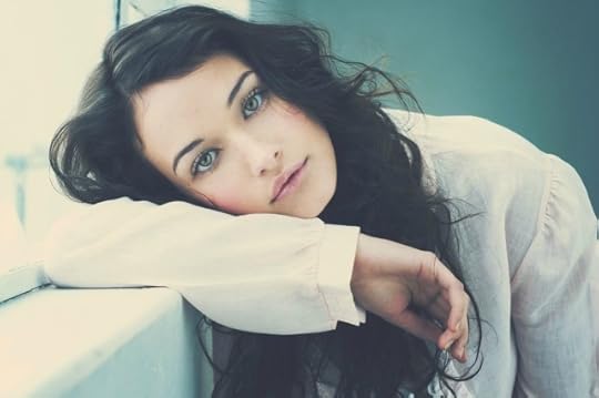 Petite nose, sharp angles around the face large eyes with long lashes her hair cascading down her shoulder and outlining her face while coercing her ears full luscious red lips.