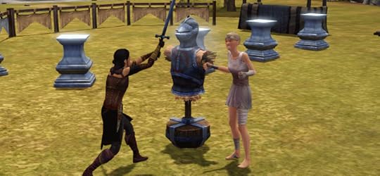 Angelique walked into the training area. Some men over by the fence chuckled as they saw her pick up a giant battle axe. She shot a glare over at them and got into ready position.