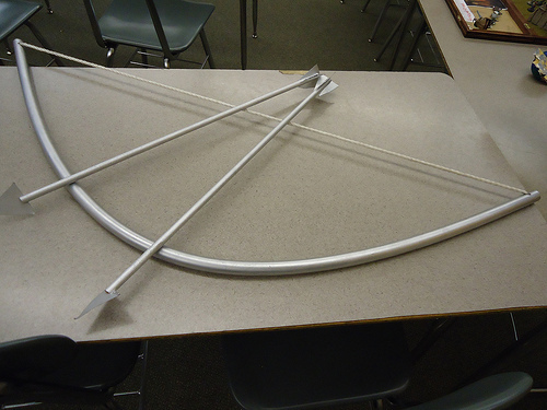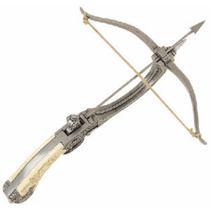 Crossbow- A crossbow is a weapon consisting of a bow mounted on a stock that shoots projectiles, often called bolts or quarrels. The medieval crossbow was called by many names, most of which derived from the word ballista, a torsion engine resembling a crossbow in appearance.