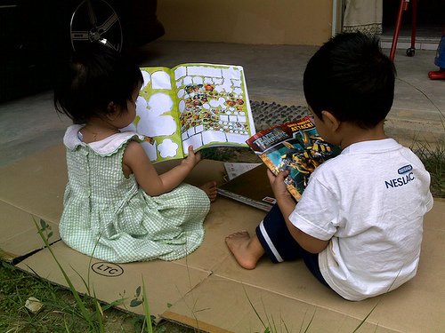 Gambar ini ada juga di bahagian "photos" di Group Malaysian@Goodreads ni. Saja je paste kat sini jugak. Ni gambar anak perempuan saya (umur 6 tahun) yang mengikut jejak langkah ayahnya yg gemar membaca komik sejak kecil lagi. Anak saya membaca koleksi komik Tiny Titans: Welcome to the Treehouse dari DC Comics. Membaca komik adalah salah satu cara bagus, bagi pendapat saya, untuk menanamkan sifat suka membaca dan membantu anak kecil itu fasih di dalam Bahasa Inggeris. Takkan nak bagi novel Charles Dickens kat budak 6 tahun, ye tak?