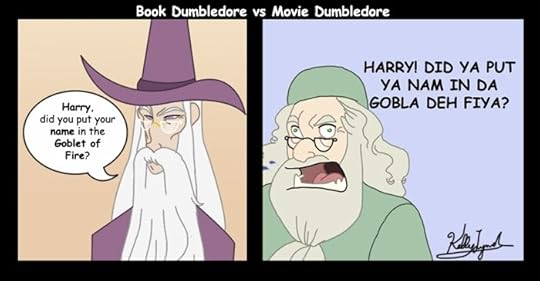 The sweet, wise Dumbledore turned into a stressed screaming old guy. He was way too intense for the character, in my opinion. 2nd of all, I recall exactly in the book and movie that nothing else but wands were allowed in the tasks, and Harry used gilly weed, (WHICH IS NOT A WAND) and they never called him out in it. They even announced him using it. WHAAAA??? Thirdly, the last scene was suppose to be super tragic and all, I get that, but they made it so dark disturbing.