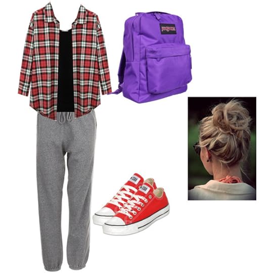 Clothing: A pair of dirty dark wash jeans, a green T-shirt, a camouflage hoodie and a pair of dusty leather cowboy boots. She has a change of jeans, a grey long sleeve, a black short sleeve, and as much socks and others as she could fit in her bag.