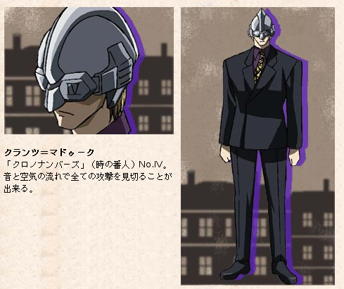 Kranz Maduke Known as Number IV, Kranz is a blind man raised to be an assassin from birth. Along with his partner, Baldorias, he is extremely violent, going as far as destroying entire towns while completing their missions, and loyal to Chronos. He wears a helmet that conceals his eyes, and he has learned to fight through sensing sound and movement. His number is located on one of the eyes of the helmet. He and Baldorias are tasked with killing the Apostles before Chronos' next strike on Creed. Kranz also participates in the attack on Creed's headquarters with the Sweepers Alliance as the decoy. He is described by Jenos as a berserker. Kranz enjoys being silent and rarely talks, thus leaving Baldorias to make the decisions. When Kranz does speak, Baldorias is more than happy to listen. His weapon is an Orichalcum knife named 'Mars', which is able to vibrate at a high frequency, allowing it to easily cut steel. He appears in the anime as one of the Zero Numbers, who defect from Chronos.