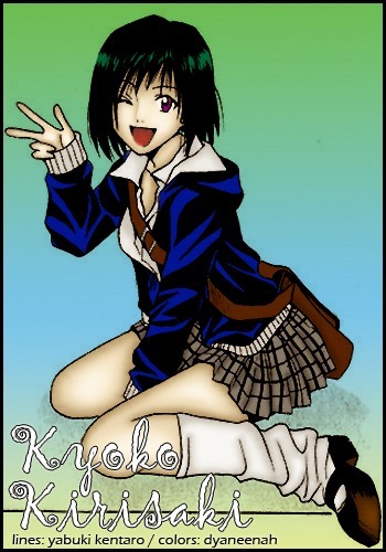 Kyoko starts to like Train when she first meets him, and falls in love with him when he saves her from dangerous criminals. Due to her feelings, she commits herself to Train's own personal philosophy to not kill senselessly; however, her infatuation with Train causes him nothing but an endless amount of headaches. She adopts a tiny black kitten that likes to ride on her shoulder. After leaving the Apostles (and, in the manga, having a brief meeting with Sephiria to determine her fate), Kyoko returns to her normal schoolgirl life, only briefly (in the anime) returning to action along with Charden to help the other heroes in the battle against Eden and the Zero Numbers. At the end, she is seen in the company of her school friends while Train walks in the street behind her. In the manga it is hinted that she killed her parents because her teacher could not get ahold of them (and she says they travel a lot), while in the anime it is stated that they merely work overseas.