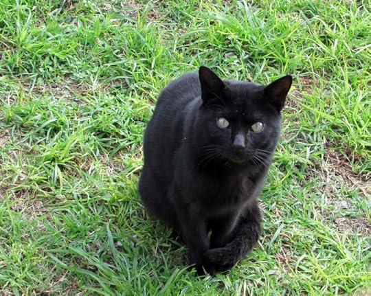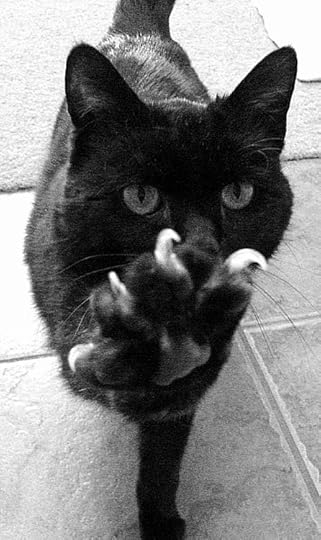 Black cat, with grey eyes and one white paw.