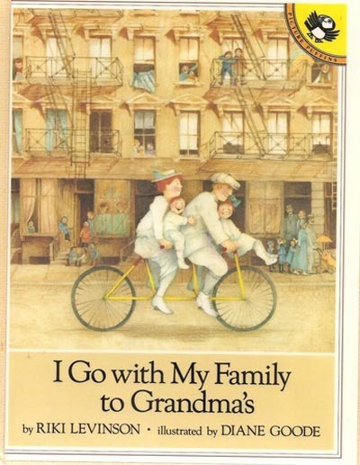 Here is another description: Five little cousins narrate the brief text: Millie's family arrives from Manhattan on a tandem bicycle, Bella's on a Brooklyn trolley, Carrie's in Papa's horse-drawn grocery wagon from Queens, Beatie's from the Bronx on the El, and Stella's by car and ferry from Staten Island. Goode makes the most of the opportunity to portray the variety of homes and transportation of the period--the crisply new Williamsburg Bridge (1903) sets the date. Again using soft-colored pencils and a predominance of earth tones, her elegantly organized compositions marvelously evoke turn-of-the-century New York. The reunion rivals Gammell's The Relatives Came in exuberance; the hordes of children include two sets of twins plus triplets in one family (the scene showing five of them sliding down a curved banister is a gem). The children look rather like Cabbage Patch dolls, but have cheerful individuality nonetheless; the scene where they all settle down for a family portrait makes a satisfying conclusion to a warm-hearted reminiscence. (Kirkus Reviews, August 15, 1986)