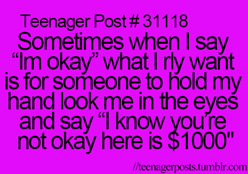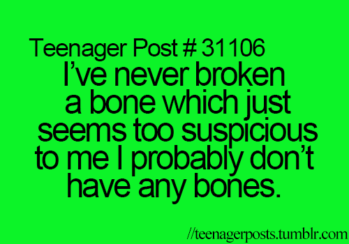 Heh I love teenager post :D also that last one. I've always been a pretty active kid and I was kind of wild when I was little and yet I've never even sprained anything. I always had a bunch of scrapes and bruises and scars but never broke anything it's really weird o.o