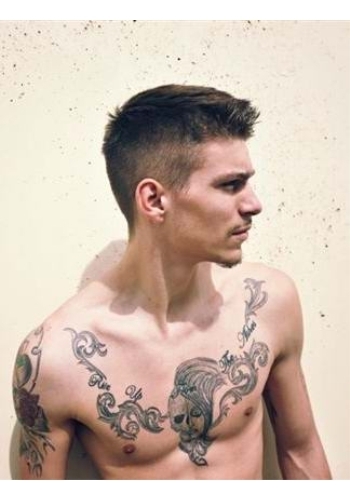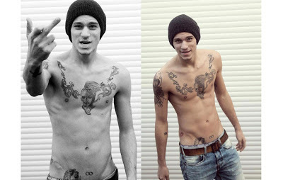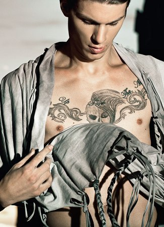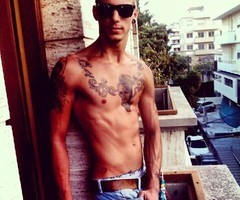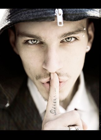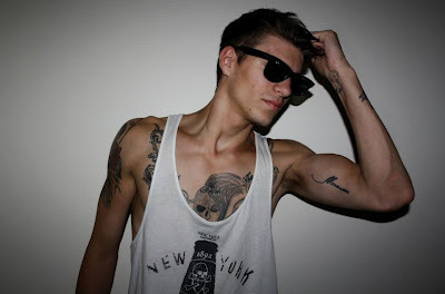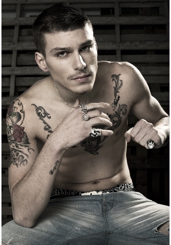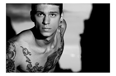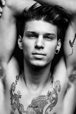 {Distinctive Markings}: A large number of tattoos cover his body. His left eyebrow is pieced and his left ear is gaged.