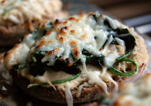 Turn on your broiler . . . and on a cookie sheet, lay out each English muffin and top with hummus. Then top with spinach . . . ten top with a heap of shredded mozzarella.