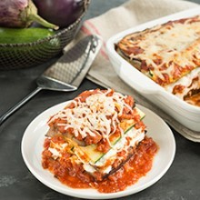 Spread 1/2 cup Bertolli® Riserva Marinara Sauce in bottom of 8 x 8-inch baking dish. Layer 1/3 of the eggplant slices, 1/3 of the zucchini slices, then 1/2 cup sauce and 1/2 of the ricotta mixture. Top with 2/3 cup mozzarella cheese; repeat. Top with remaining eggplant and zucchini slices, then remaining sauce and remaining 2 tablespoons Parmesan cheese.