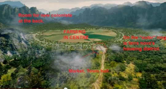 In the center of Terra Nova are alrge fields of different plants. The market and town square are by the opening gate by Commander Taylors hut and housing runs along the outer rim of the community.