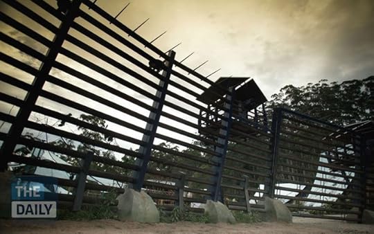 Large wood gates with spikes encircle the community, watch towers with sonic centry guns are at every couple feet. Each watch tower has at least 3 soldiers in each one.