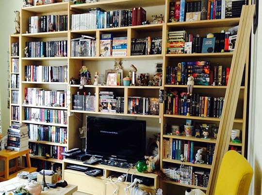 Ik kan niet zo goed mooi en recht voor de boekenkasten staan, dus is deze foto wat awkward genomen. En er staat wat in de weg. Het middenstuk boven de tv zijn trouwens dvd boxen.