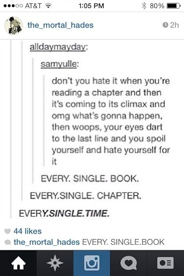 my life, I hate doing it but I get so curious so I start reading ahead and then I spoil myself, and I hate spoilers because then it slows me down cause I start dreading that part which is spoiled, cause I know what's gonna happen. I try not to do it, but I get so curious, especially when someone tells me that something's gonna happen at the end