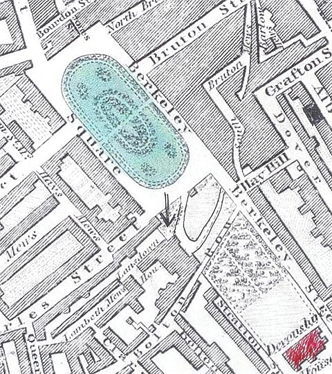 Map view of Grosvenor Square - note the proximity to Brook Street where Sebastian lives (you can also see the tip of the green area marking Berkeley Square near the bottom right (home of the Jarvis family):
