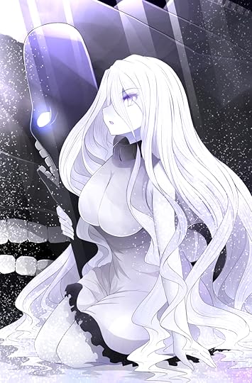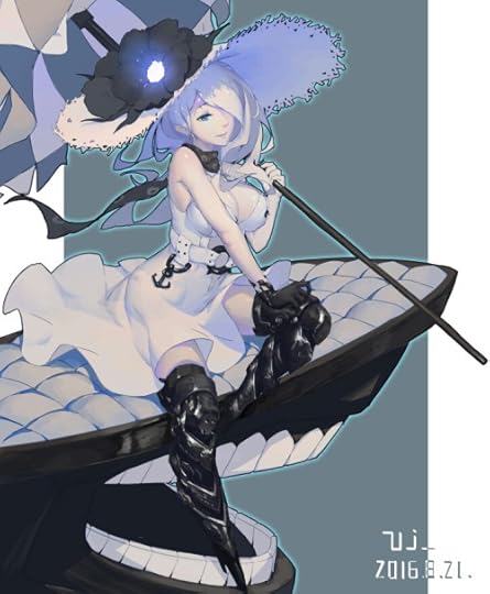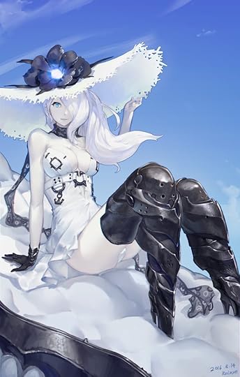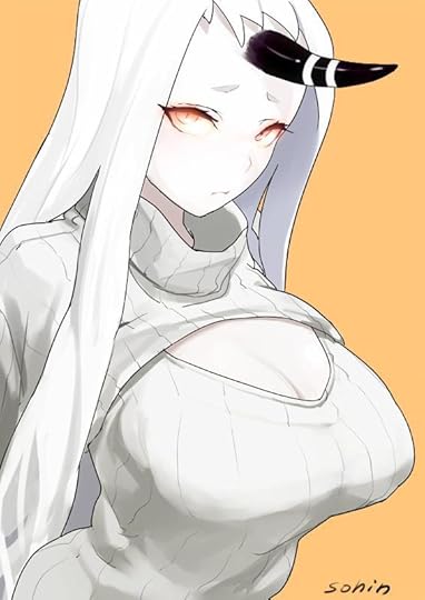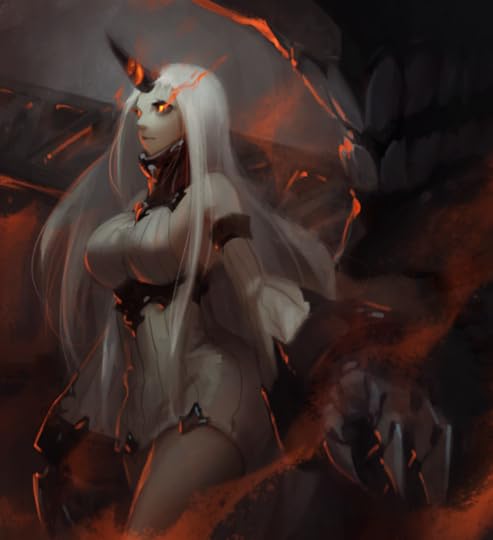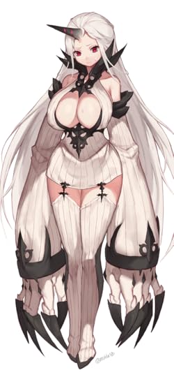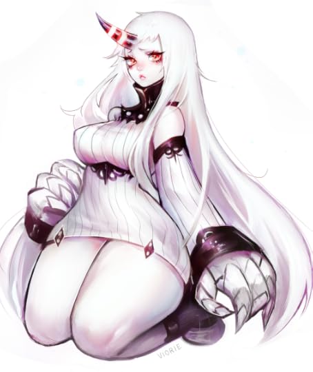 As is expected of some Abyssals, Try has been gifted with three forms. Whether through some sick twist of fate or through the convenience of future masters, each form is exceedingly beautiful in its own way. Some, however, have noted that her first two forms don't look all that bright. While they aren't wrong, Tryione does tend to have a look of surprise or worry on her face in most cases. At other times, she might be smiling, that look seems to be reserved for her final form. The apparition that is usually what others see of Tryione is a young female of about twenty years of age. Her eyes, while large and framed neatly with lashes of varying sizes, are a brilliant red that looks a bit like the flames of a large fire. Pale-skinned and incredibly fair-haired, she stands at twelve feet tall. While she gives no Vroulike a run for their money, she is larger than humans and some other species. She's of a shapely nature, and those who can overlook certainly other features may be inclined to try to flirt with her. Likely not a good idea, most would be deterred at any rate by the massive, slightly curved horn protruding from her forehead. Or, even more likely, her claw-like hands would be warning enough. They're tipped black and fade into the same color as her skin. They're large enough to brush across the floor when she stands at full height and have quite the grip--she could easily rip a tree from the ground with as about as much effort as it takes to breathe. Between this appearance and the one marked as the oni within the Abyssal community, there isn't much difference. Tryione simply grows taller, adding on two or three feet to her height. All other bodily proportions follow suit, and her horn straightens out. Between the first two, and the last, there are a few more changes. The "summer" look, as one might call it, is surprisingly normal in most aspects. She still has the same figure and height, but with less noticeable disfiguration. Her eyes are a glowing blue and her hands would appear to be normal. Her right hand, however, is blackened. Most would say it looks like a glove. The only disfiguration, aside from her hand, would be her legs. Rather than slender calves and legs that could go on for days, they appear to be clad in armor. It starts from the knee down, and taper into what look like heeled boots. They're quite heavy and anyone looking to remove them is in for a surprise. Among her forms, Tryione seems to prefer dresses. Her normal appearance and that of the oni are most commonly seen in a fitting white dress, with arm warmers that billow out to encompass her hands. In her summer look, she wears sundresses and is usually seen with a wide brim hat and a black scarf around her neck.