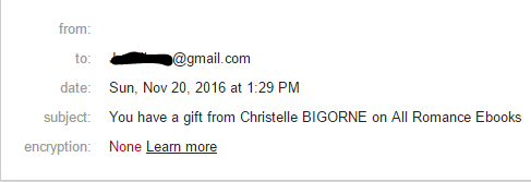 As a matter of fact, it did not. Where the email senders name would be it says "unknown sender". If the email subject hadn't been "You have a gift from Your GR Secret Santa on All Romance Ebooks" I probably would have deleted it. So ARe has bugs?