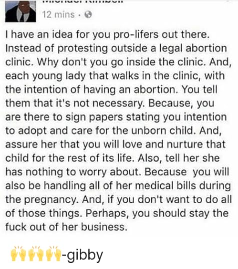 And I can't help but wonder how many "pro-lifers" are trying to get rid of guns, which kill ((let's be real: the bullet going through your body is what ends your life)), make healthcare more accessible to save lives, reduce the military which is designed to kill and help impoverished starving people get better quality...everything.