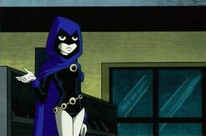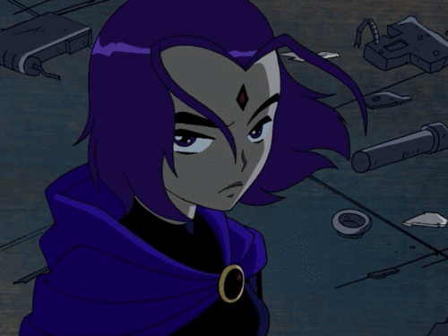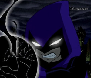 [Clothing Style:] She usually wears a blue cloak with a hood, with matching blue ruffled ankle-boots with black/gray soles, with a leotard-like long-sleeved shirt that is blue/black with cuffs at her wrists of the same blue of her cloak. On her cloak, she has a circular black/red jewel set in a gold plate that attaches the whole thing together; it covers her it's fixed to beep/glow when there is trouble. The jewel also sometimes has a raven head shape in the jewel. Around her waist she has a red and gold belt with the same jewels around it and no pants. the belt ties at the back like a cord.