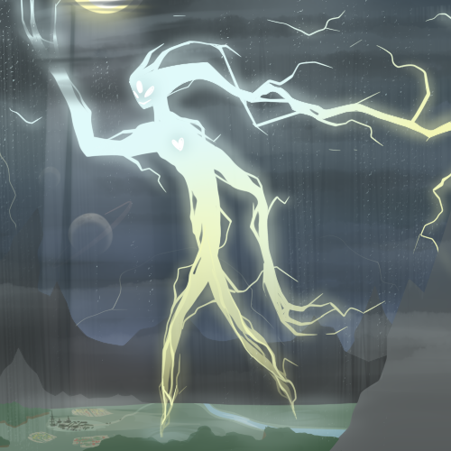 Fast forward about a few hundred years for him, he is now about a adults height in physical form. He has found out more about his kind from meeting with others of his kind. Finally understanding what he is has helped him figure out his place in the world. He has heard some folklore about beings if lighting being formed from the spots the lighting dragon has struck. He has scoured the land day and night looking for said dragon of lore. His main goal right now is to find the spot of his origin.