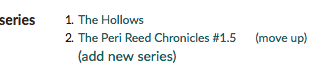 I am trying to get it to show up in both series. Whoever added it originally, however, called the series "The Peri Reed Chronicles #1.5 " which is incorrect. It should just be called The Peri Reed Chronicles (without the #).