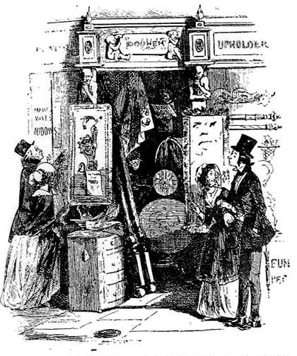 But then what a wonderful stage Dickens gives to Mrs. Gamp again and to her blundering figures of speech - "if I may make so bold as speak so plain of what is plain enough to them as needn't look through millstones, Mrs Todgers, to find out wot is wrote upon the wall behind" - and of malapropisms - "in this promiscous place". And how she tries to win the favour of everyone, except Chuffey! The comedy is mixed with and gradually gives way to a more serious and dramatic tone, e.g. through Mr. Chuffey.