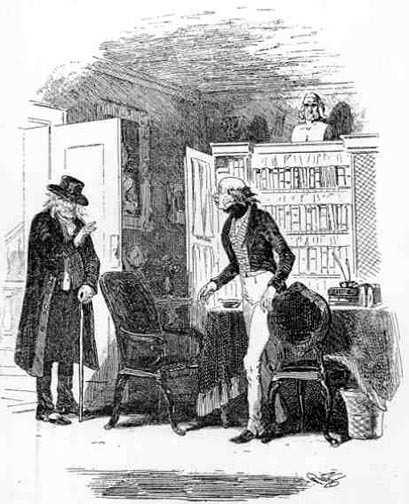 Peter I enjoy ALL of the illustrations Kim posts, but The Pinch/Apparition is my new favourite from this novel. The posture of Chuzzlewit, hand up and with his head, covered by a hat, with a rather mysterious tilt, Tom, looking at him in the second of recognition, and, of course, the very neat and finally ordered room. Perfect.