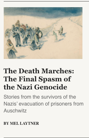 Mel, I read your article last night and found it extremely well-written -- devastatingly so. Congratulations on its publication. I wanted to look back at the paragraph on the survivor who later had a role in the TV show "Hogan's Heroes," but I can't find it again -- only the part at the end about his memories, assuming I haven't gotten the names tangled. That was surprising. I know I saw episodes but no memory of details except that it shied away from the kind of devastating material in your article and turned it into a comedy. Guess the writers did not deem the world ready.