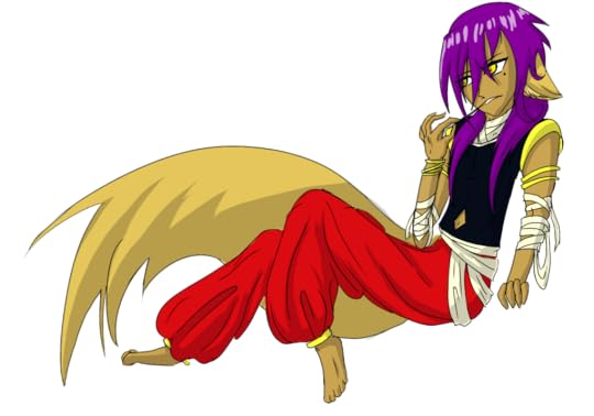 {Clothing} : He wears a black thing vest top with a small diamond cut out where part of his stomach is and shows off the bottom portion of his mid rift. He wears long baggy red pants tied loosely around his ankles with a clasp. On both of his arms as well as his neck and stomach area are a series of worn out bandages from past fights. One of his arms has a few golden bangles around his wrist while the other arm has a few gold bands around his upper forearm.