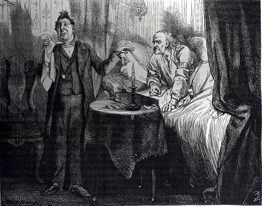 The Chuzzlewit "curse" under which old Martin feels himself labouring implies a simple, superstitious nature in his interview with Mrs. Lupin she counsels is only the operation of "sick fancies." Several pages later, when we have learned how his fortune has brought nothing by familial dissention, his aggressive demeanour (as signalled by his clenched fist and jutting jaw) seems fully justified, especially since we have already judged Pecksniff a posturing, pompous hypocrite. In addition to maintaining continuity through old Martin's posture and attitude (despite the absence of the skullcap from the Phiz plate), Barnard has chosen to furnish the apartment exactly after Phiz's manner, with a small, round table at the bedside, the rumpled bedclothes, and the abundant draperies of the bed-curtains. However, whereas Phiz had employed the drapery to suggest the old man's closeness to Mary Graham and his tendency to exclude others from his confidence, in Barnard's plate the pillar of rectitude and platitudinous sentiment has replaced the curtains, which Barnard has re-positioned to the extreme right as a frame to complement the chair and Pecksniffian shadow at the extreme left. Whereas Phiz has drawn the viewer's eye right of centre, to the heads of old Martin and young Mary, in order to convey their sympathetic understanding, Barnard has shifted the mood from watchful suspicion to character comedy as Pecksniff performs his serio-comic monologue for an audience of one. As the left hand, gesturing, and the right hand, stagily displaying the oversized handkerchief, a theatrical property long before vaudeville, suggest, Pecksniff is always acting a part. He is as comic a tragedian as Wopsle will later prove to be whether in the Gargerys' parlour or on the London stage in Great Expectations (1861, not issued in the Household Edition until 1876, and illustrated not by Barnard, but by F. A. Fraser).