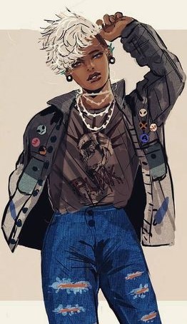 Lance Corporal Peterson excelled as a sniper, but they were miserable because they were constantly misgendered and the verbal abuse from superior officers that was common in the marines reminded them too much of their father. Sunday couldn't just quit the marines, but they had a plan to masquerade as a trans man in order to get discharged. Just as they were about to put their plan in action, the outbreak began and quickly spread across the globe. In the confusion, Sunday deserted, taking their weapons and gear along with them, and decided to take their chances on their own. They grew out their hair and bleached it, got tattoos and piercings from other survivors they met on the road, and got a whole new punk style. They still kept the marine issue boots though.