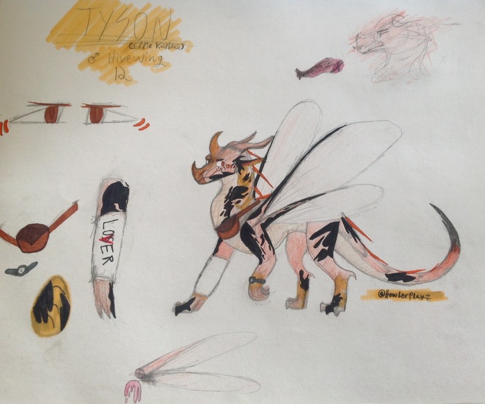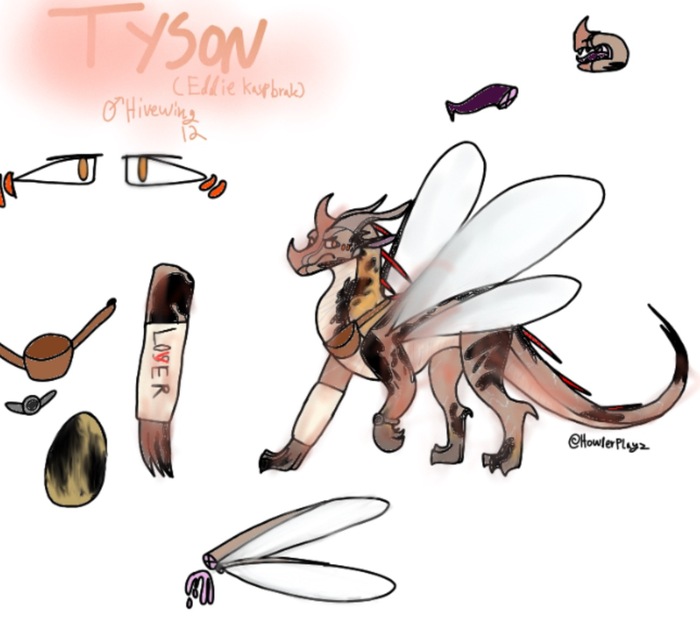 }{Appearance Details: Tyson is a male HiveWing with brown-grey eyes. He's around average weight for his age. His scale coloring is a kind of orange. Along his neck and on a few of his talon scales, there's a yellow tint. Just like every other HiveWing, he has black splotches splattered around his body and a long stinger at the end of his tail. Of course he never really uses it.}{