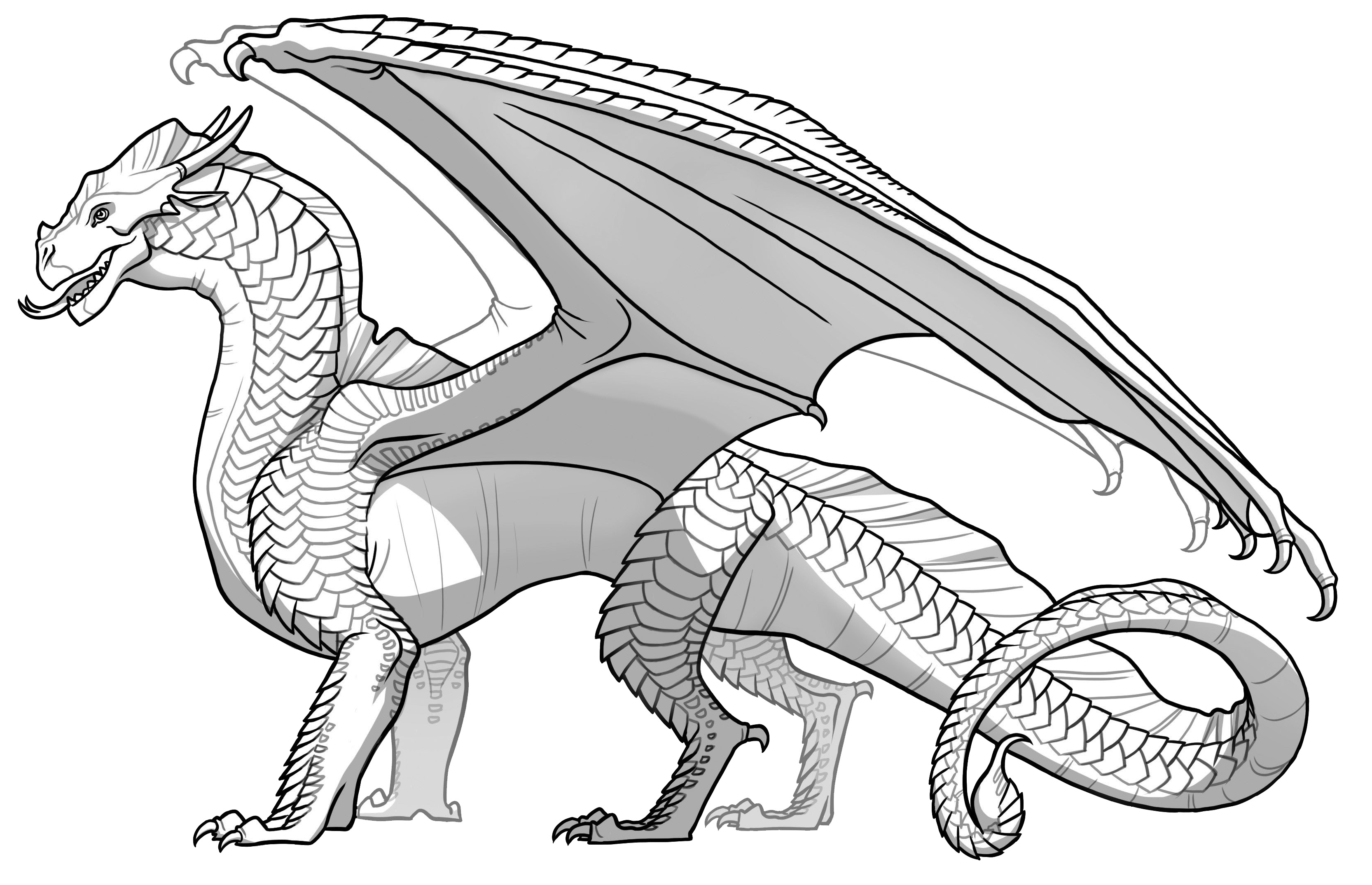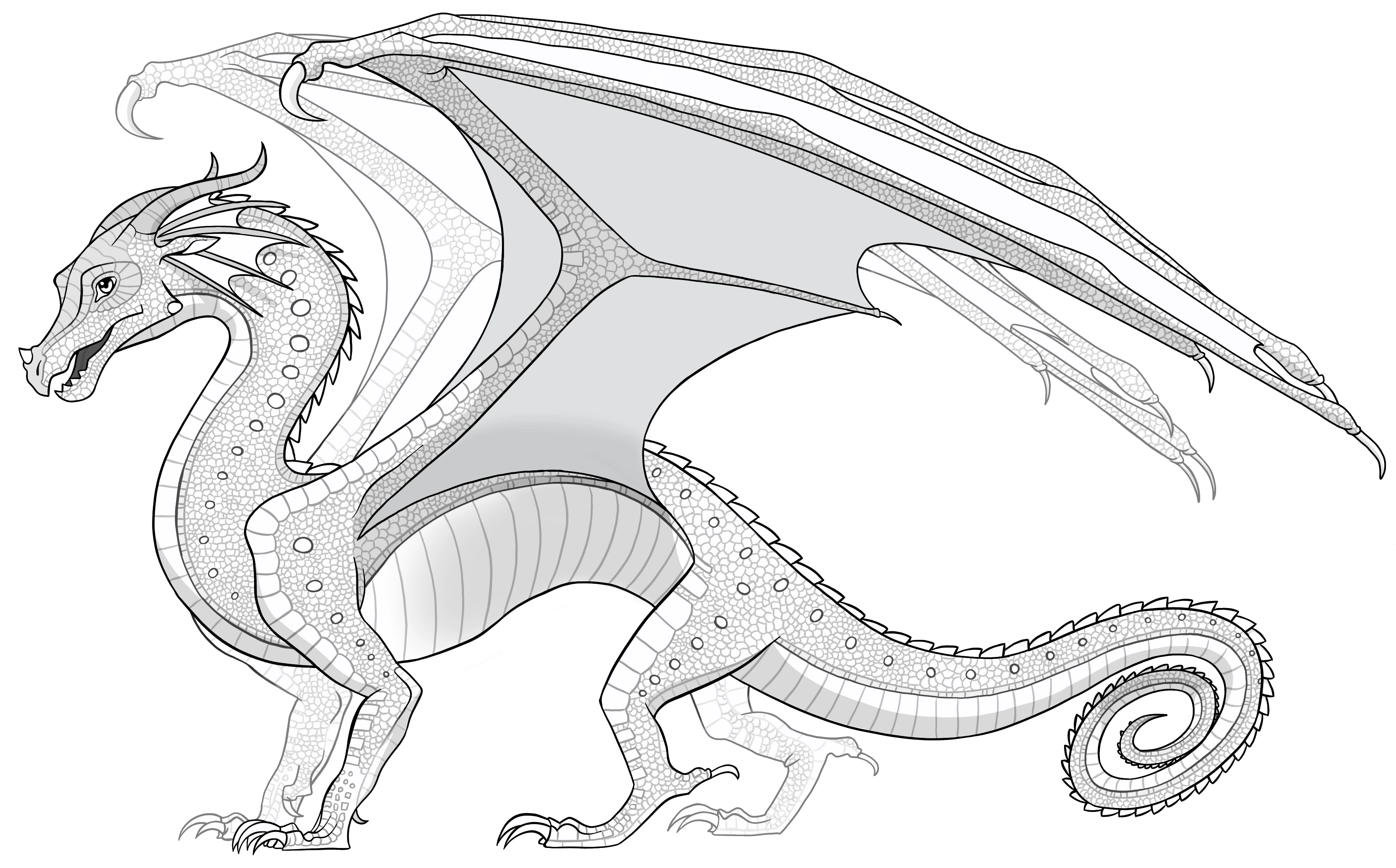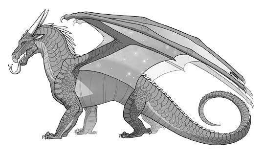 NightWings have dark colored scales that range from blacks, dark greens, dark blues and purples. NightWings usually have silver, dark red, purple, dark blue or green underbellies and have silver scales along their neck. They have forked, black tongues and sometimes have twisted horns. Their wings have silver scales scattered across them, forming patterns that are genetic. They basically come in every color, as long as it's dark. They can have eyes that are dark blue, purple, dark brown, or dark green. Mind-reading NightWings have silver teardrop scales at the corners of their eyes.