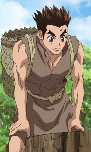 Pre-Stone World, he wore a typical school uniform with a lab coat over it. After waking up in the Stone World, he switched to wearing animal skin clothing in a rudimentary manner. After Yuzuriha's de-petrification, he gets these clothes patched up in a better manner. He has Albert Einstein's mass–energy equivalence formula (E = mc2) written in his own blood across the breast of his shirt.