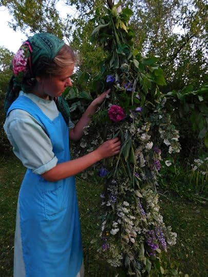 "Never had the Maypole been so gayly decked as at sunset on midsummer eve. This venerated emblem was a pine-tree, which had preserved the slender grace of youth, while it equalled the loftiest height of the old wood monarchs. From its top streamed a silken banner, colored like the rainbow. Down nearly to the ground the pole was dressed with birchen boughs, and others of the liveliest green, and some with silvery leaves, fastened by ribbons that fluttered in fantastic knots of twenty different colors, but no sad ones. Garden flowers, and blossoms of the wilderness, laughed gladly forth amid the verdure, so fresh and dewy that they must have grown by magic on that happy pine-tree. Where this green and flowery splendor terminated, the shaft of the Maypole was stained with the seven brilliant hues of the banner at its top. On the lowest green bough hung an abundant wreath of roses, some that had been gathered in the sunniest spots of the forest, and others, of still richer blush, which the colonists had reared from English seed. O, people of the Golden Age, the chief of your husbandry was to raise flowers!"