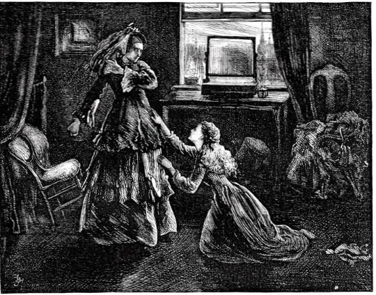 David and Martha have heard this manic tirade, but David was reluctant to intervene, much as he felt impelled to, because he believed it was Dan Peggotty's right to see Emily first. At last he heard a familiar step on the stairs. Rosa Dartle issues a few vicious parting words, and she and Dan Peggotty pass on the stairs as he rushes in. On seeing her uncle, Emily cries out, and collapses in a faint. David rushes into the room to see Dan Peggotty supporting Emily, and tenderly covering Emily's face with his handkerchief, before carrying her "motionless and unconscious, down the stairs".
