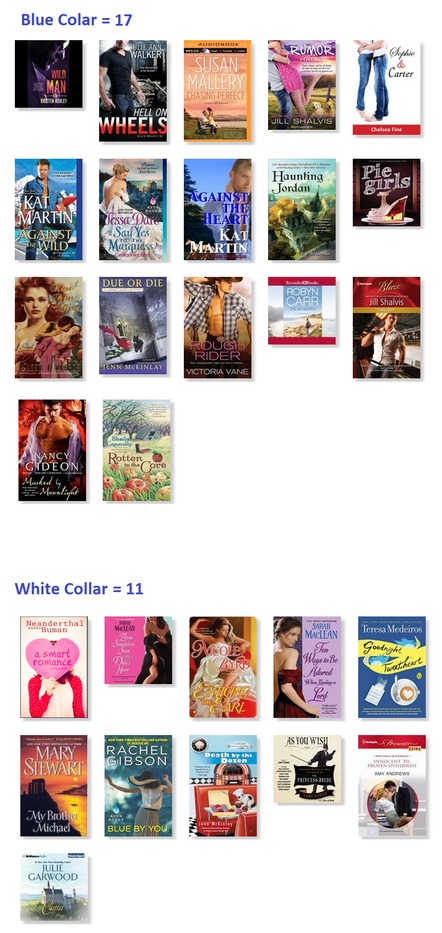 Well, its close but white collar is leading 5-4 according to my challenge bookshelf. I just finished reading All of Me in which the the hero, Chris Merit is a sought after millionaire artist who paints dragons and contemporary art for high end art galleries. I posted Chris as blue collar because he is an artist and does not work in an office.