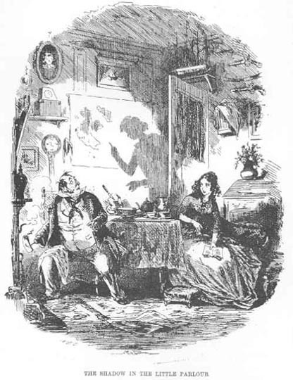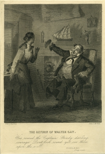 "The Captain's delight and wonder at the quiet housewifery of Florence in assisting to clear the table, arrange the parlour, and sweep up the hearth—only to be equalled by the fervency of his protest when she began to assist him—were gradually raised to that degree, that at last he could not choose but do nothing himself, and stand looking at her as if she were some Fairy, daintily performing these offices for him; the red rim on his forehead glowing again, in his unspeakable admiration.",