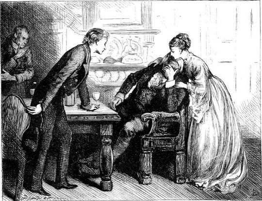 Uriah seems to be emboldened by the conversation, and arranges for himself, David and Mr Wickfield to be alone drinking after dinner. He proposes many toasts, and Mr Wickfield is drinking heavily. When Uriah alludes to "the fairest of her sex" Mr Wickfield's eyes are painfully drawn to his wife's portrait. Uriah continues: