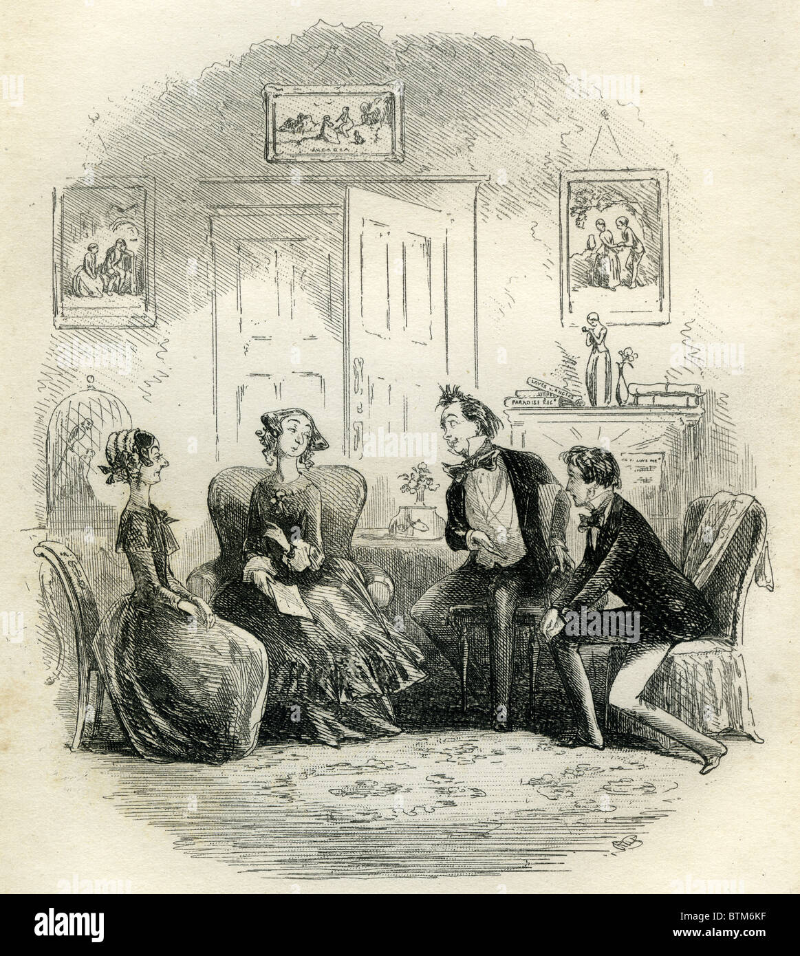 I love Phiz's illustration. It's just how I pictured the scene with the aunts with their straight backs, Traddles with his hair sticking up, and David looking anxious. Thanks for telling us more about the paintings, fishbowl, and birdcage, Jean.What a contrast between Traddles' Sophy who is so competent that her family doesn't know how they can live without her, and Dora! I hope that David can eventually afford to have a servant in their house because Dora likes to be treated like a child, and can't cope with any responsibility or adversity.