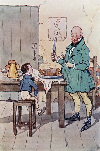 His mother dead, expelled from Blunderstone Rookery, and away from the Peggotys [sic], David continues his search for surrogate parents,and here the amiable landlord and his good, compassionate wife, rejecting his role as the "little gent," offer themselves as just that, and the public house with the parlor door opening directly into the bar becomes, for a brief moment, a refuge and a home for the orphan boy.