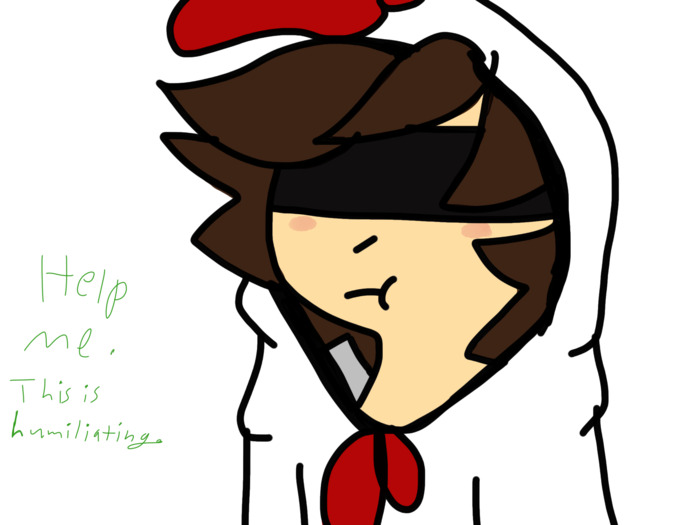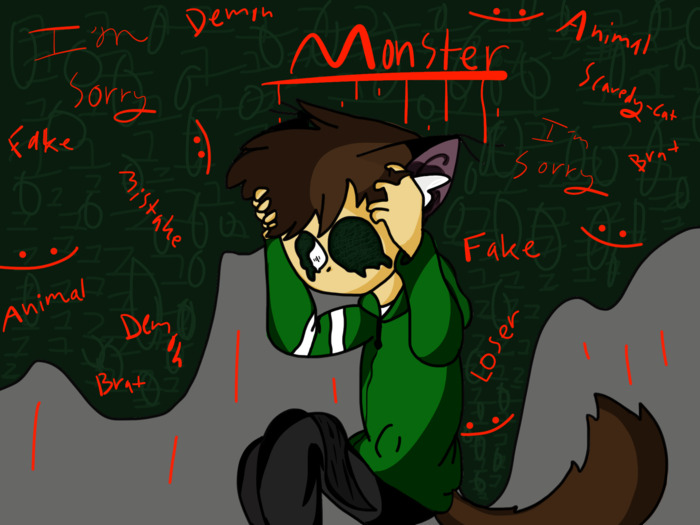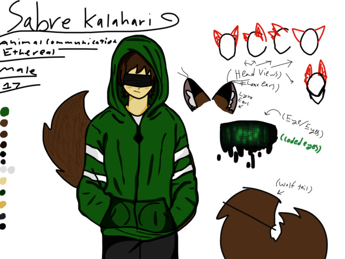 }{Appearance Description: Sabre is a tall, skinny boy. He wears a blindfold 99% of the time as well, because he thinks that there is something wrong with his eyes. Sabre, also, has unsheathable/sheathable claws that come from under his nails. They are incredibly sharp, but he rarely uses them. Sabre often wears a green hoodie with white stripes upon its sleeves. However, he will every now and then wear a black or gray hoodie. He does own a chicken hoodie as well, but he rarely wears it. His eyes are.. Strange. As I have said before, he thinks there is something wrong with them. They are binary-coded, and are made of full blown ink. However, when the ink begins to fall, it never truly lands. “It’s like a river meeting a never-ending waterfall.” Also, his hair is a dark brown, and he does not have ordinary ears on the side of his head. He has lynx ears, which are often mistaken for wolf ears. He also has a large, brown, bushy wolf tail. On Sabre’s back, he has the tattoo of a phoenix, and on his left arm/wrist underneath he has a fox tattoo that goes around a snake eye.}{