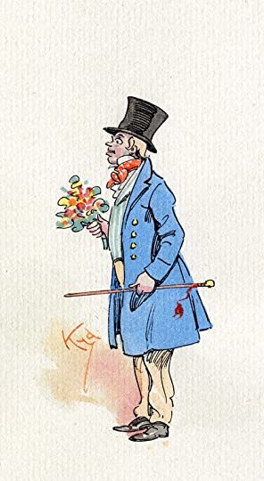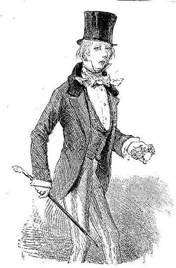 “He was neatly attired in a plum-coloured coat, with as large a collar of black velvet as his figure could carry; a silken waistcoat, bedecked with golden sprigs; a chaste neckerchief much in vogue at that day, representing a preserve of lilac pheasants on a buff ground; pantaloons so highly decorated with side-stripes that each leg was a three-stringed lute; and a hat of state very high and hard … [he] carried a pair of white kid gloves, and a cane like a little finger-post, surmounted by an ivory hand marshalling him the way that he should go.”