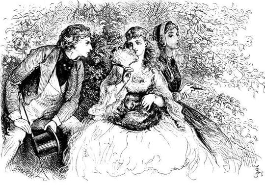 Barnard sets his illustration of the protagonist's courtship in Mr. Spenlow's garden on his daughter's birthday. Barnard renders Mr. Spenlow's young guest, proctor-candidate David Copperfield, as far more earnest than the vain, self-centred, exquisitely dressed Dora, who has just received the bouquet that David purchased for her that morning at Covent Garden. Her older friend, Miss Julia Mills, acting as chaperon, discretely keeps to one side, but Dora seems much more interested in her flowers and dog Jip than in the well-dressed young man with the riding crop and penetrating gaze. To focus the viewer's attention on the doll-like Dora, Barnard has made her the central triangle in his composition shading the barely seen figure of Julia Mills and crowding David into the left register. Already David has received his usual rebuff from the jealous pet, and, thanking David, Dora has laid the floral tribute to her beauty "against her little dimpled chin," just as in Dickens's text.