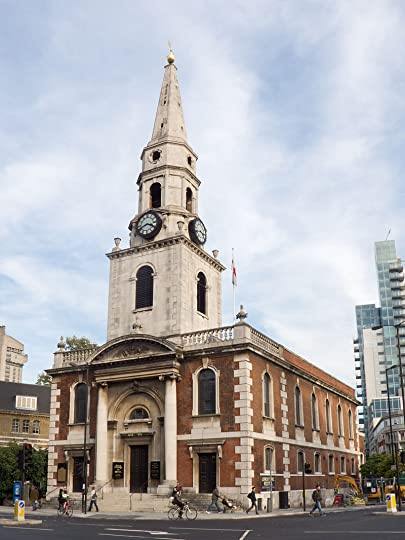 It is the Church of St George the Martyr, in the historic Borough district of Southwark, in South London. Specifically, it is on Borough High Street at the junction with Long Lane, Marshalsea Road, and Tabard Street. Here it is now: