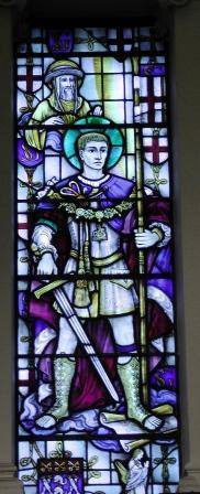 The Church is named after Saint George, and there is a stained glass window depicting him. The figure of St. George, sword in hand, is behind the altar on the left panel of the stained glass window:
