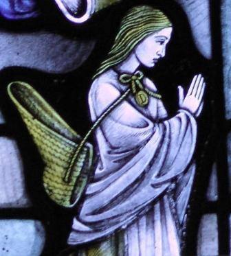 Much later, as we have read, Charles Dickens was to set several scenes of Little Dorrit in and around St. George's Church. There is a small representation of Amy Dorrit in the east window of the church, as part of the window of St. George. If you follow the line of his sword to its point, you will see that his foot is resting on a piece of curled parchment. Directly beneath this parchment there is a much smaller, kneeling figure of a girl, whose hands are clasped in prayer, and whose bonnet is dangling behind her back.