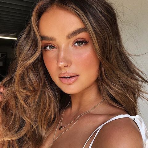 She has brown hair with lots of light blonde highlights, and her hair is really wavy to the point that it looks curly. She has amber colored eyes and a natural blush to her cheeks